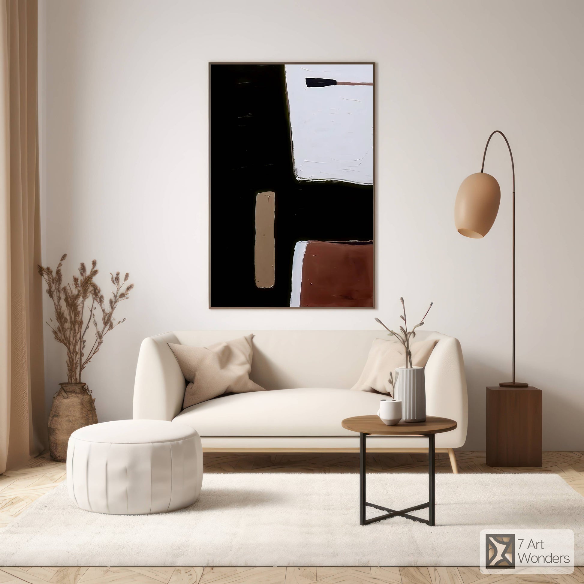 Embrace the power of simplicity with this bold abstract artwork, an intriguing blend of black, white, and brown colors. The minimalist design, composed of rectilinear forms and color field minimalism, captivates with its sparse use of color and simple shapes. Its ultrafine detail creates a stunning depth that elevates the piece, making it an ideal choice for those seeking to add a touch of modern sophistication to their space.
