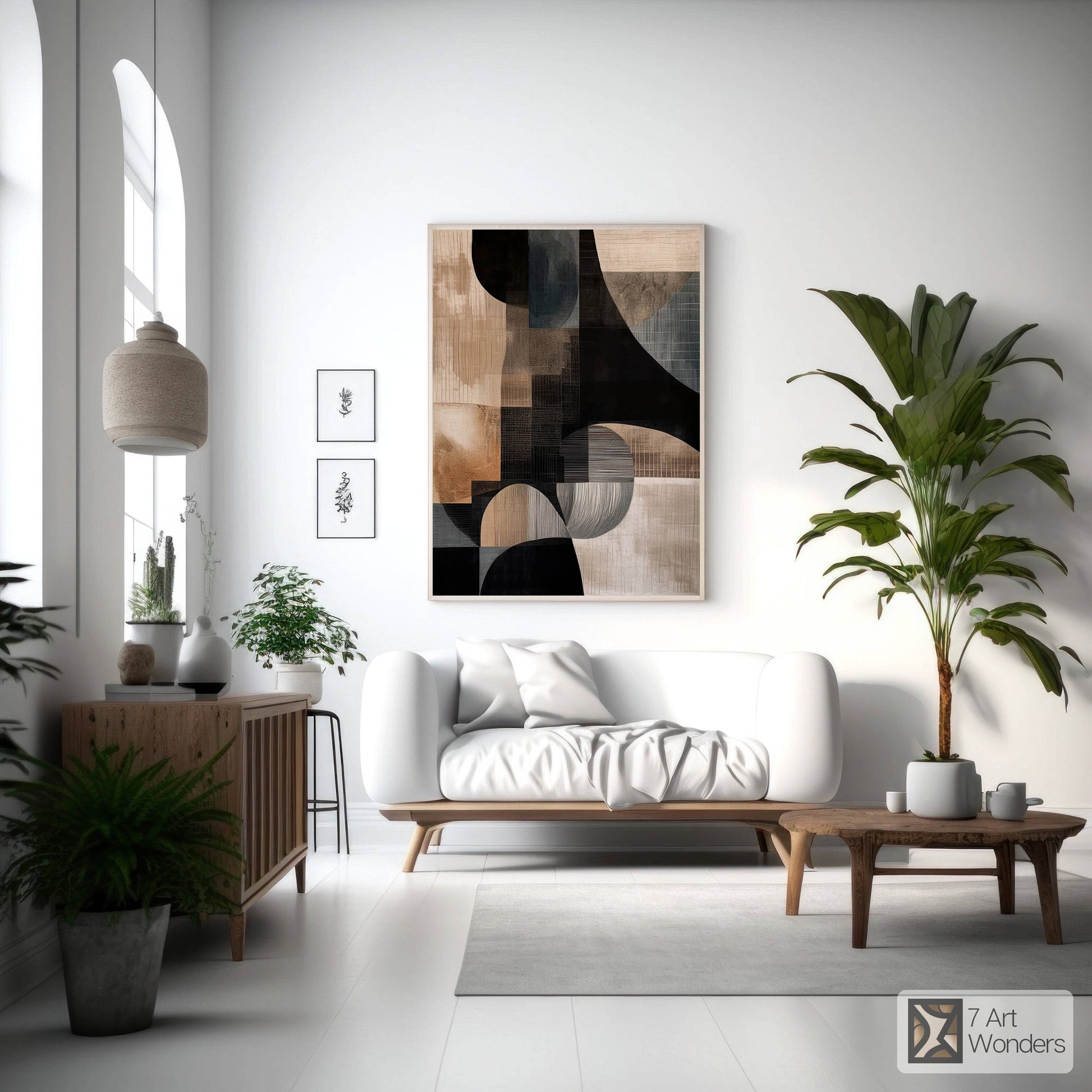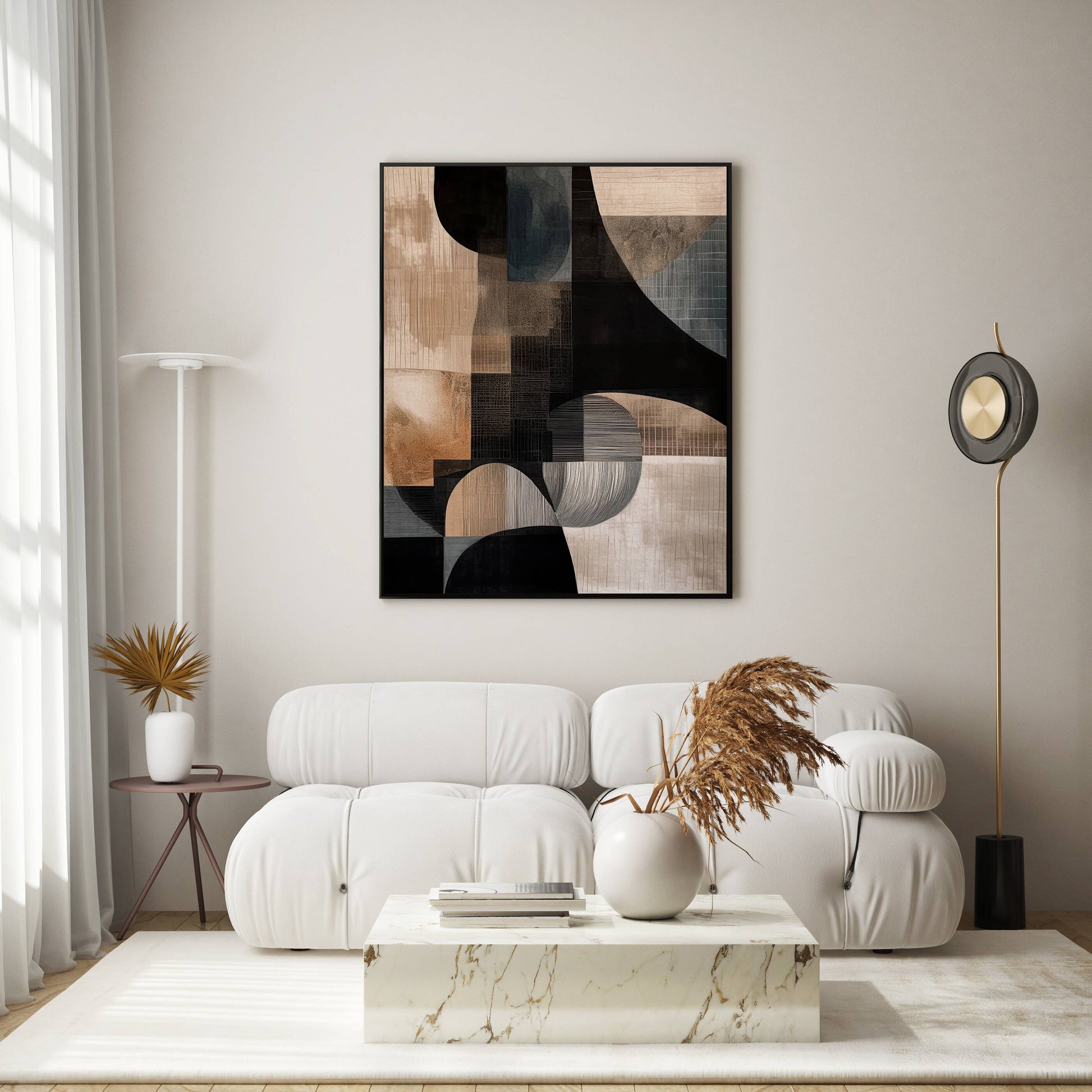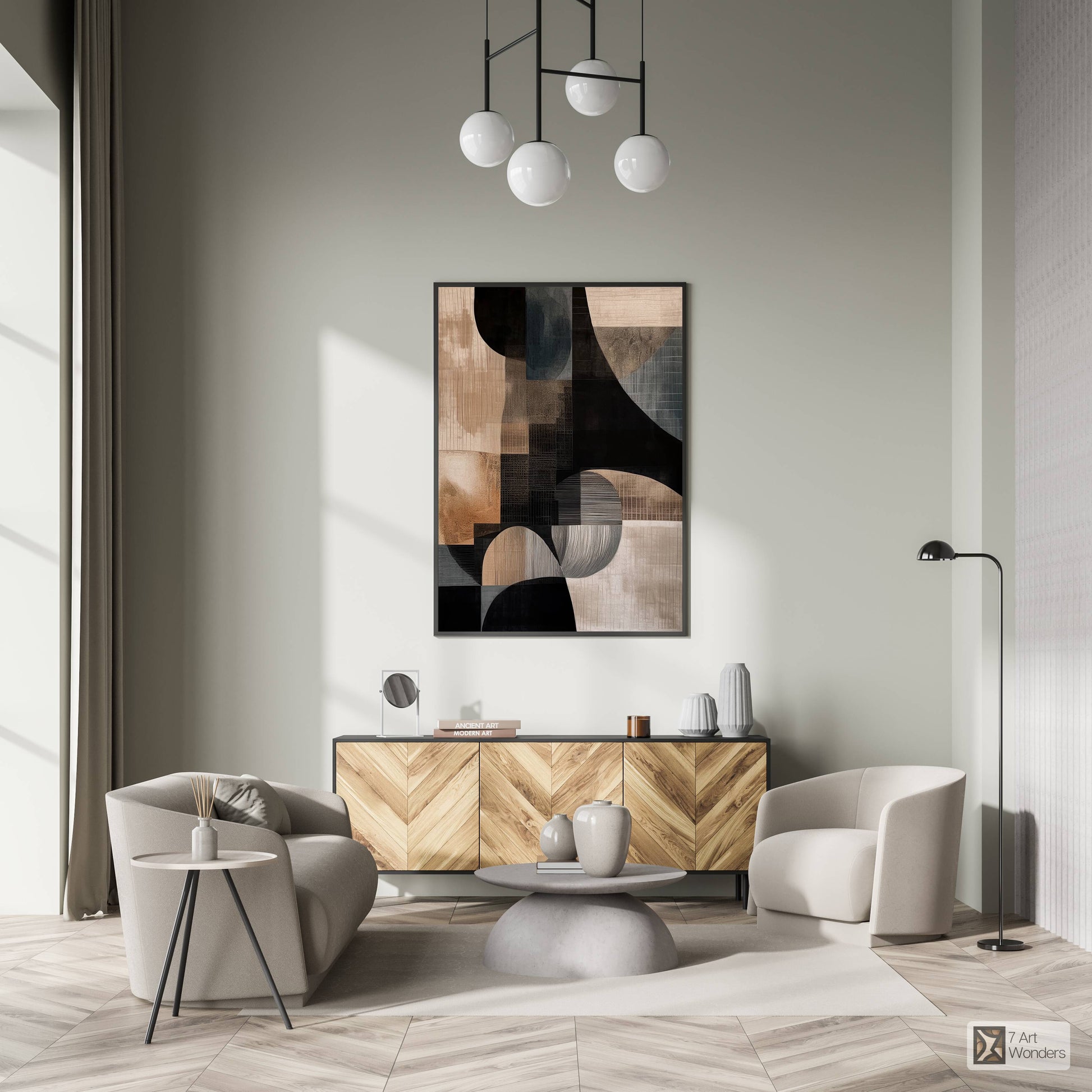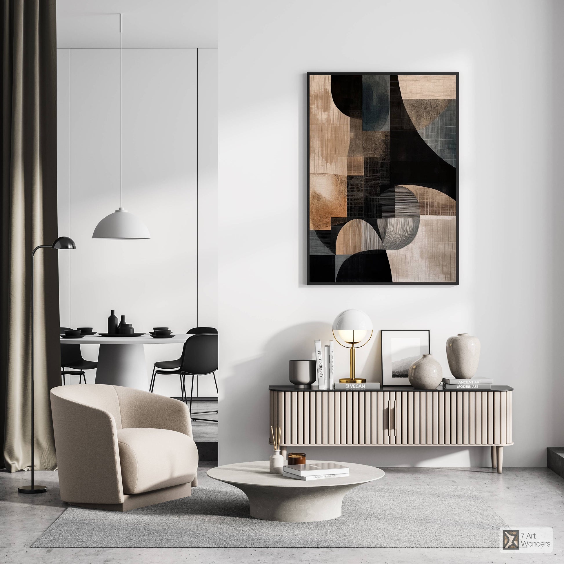 Exuding an industrial chic appeal, this digital artwork presents a myriad of brown and beige shapes, intertwined with curvilinear forms and kinetic lines. The interplay of muted earth tones and the carefully designed composition evoke an abstract representation of landscapes, transforming mundane materials into a captivating grid-like arrangement.