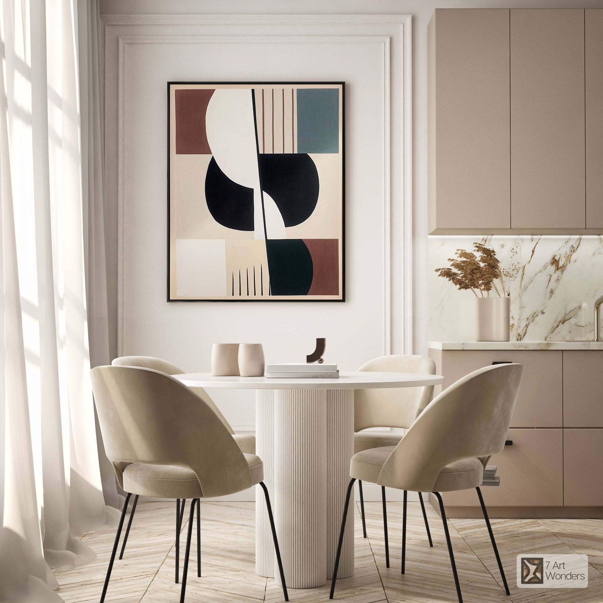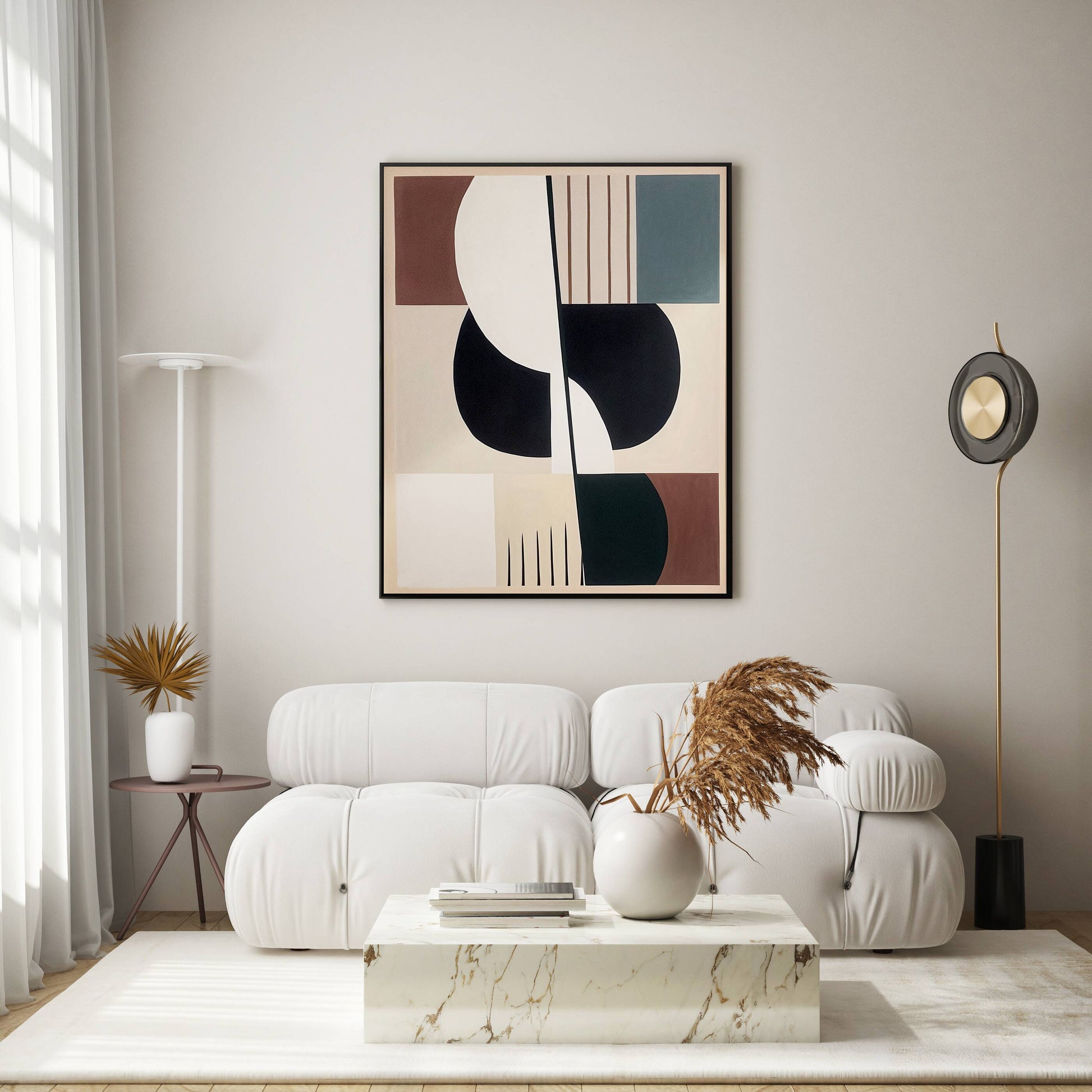 Delve into the mesmerizing world of this abstract digital artwork, where classic balance meets modern minimalism. The intriguing play of black, white, and tan geometric shapes against a backdrop of light maroon and dark green sets an expressive tone, while the graceful curves add to the piece's aesthetic appeal. The artwork's simplicity and elegance make it an exquisite addition to any interior.