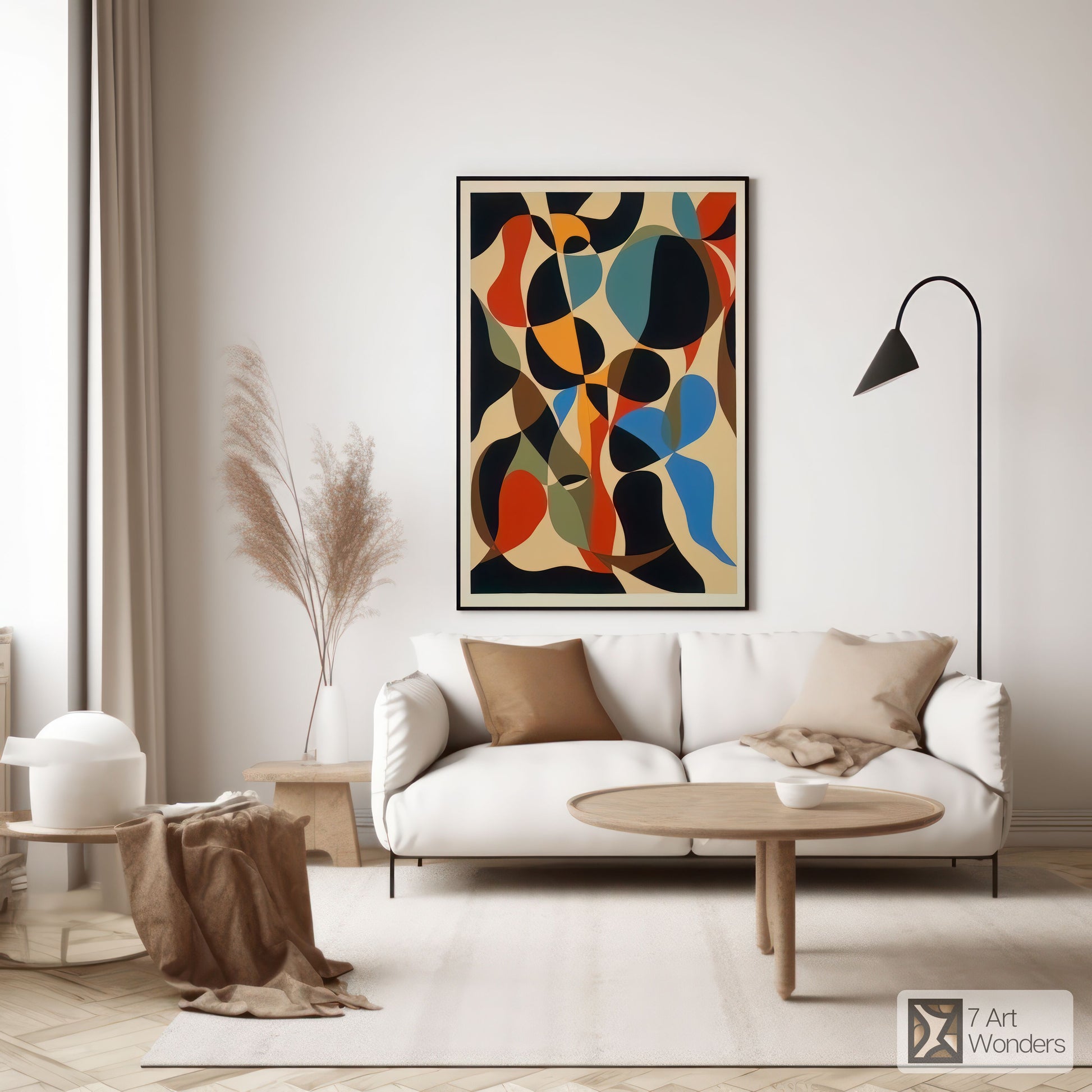Retro abstract digital print, showcasing an array of shapes and colors that evoke a playful spirit. The artwork, which takes inspiration from various styles, features smooth curves, patterned surfaces, and captivating repetitions. This eye-catching piece is perfect for infusing any space with a touch of artistic brilliance.