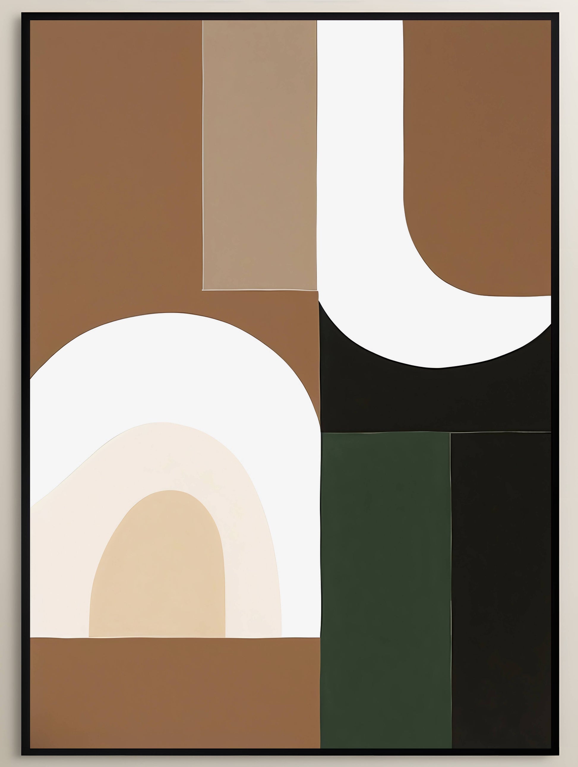 Adorn your walls with this fascinating piece of artwork, presenting an array of geometric shapes in cream, black, green, and beige. Mirroring the elegance of arched doorways and the simplicity of minimalist abstracts, this composition harmoniously blends bold color-blocked designs with nature-inspired shapes. The result is an intriguing wall art piece that resonates with warmth and artistic depth, perfect for enhancing any interior design.