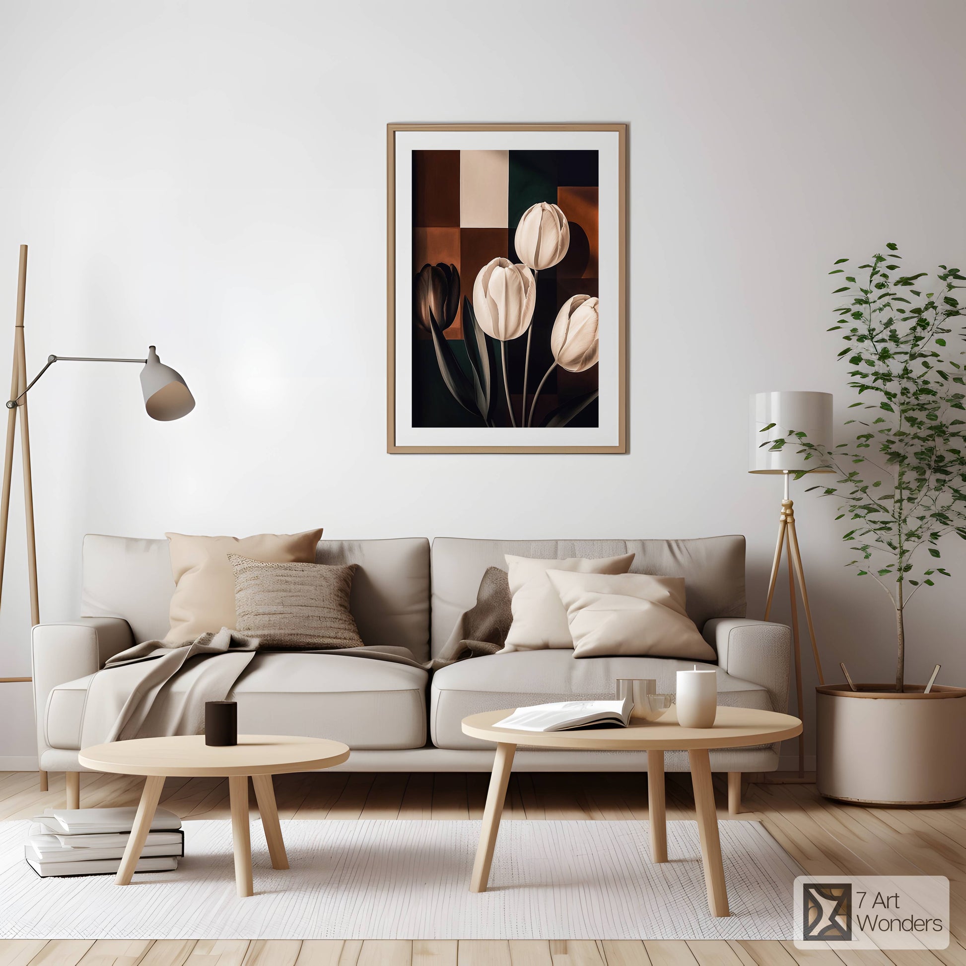Immerse yourself in the sublime elegance of this digital artwork featuring white tulips set against an earthy brown backdrop. The bold geometric patterns, combined with a moody color scheme and strong light-shadow interplay, create a surreally abstract composition. Infused with a glossy finish and reminiscent of Renaissance-inspired chiaroscuro, this piece elegantly juxtaposes the natural beauty of tulips with luxurious geometry, making it a captivating addition to any setting.